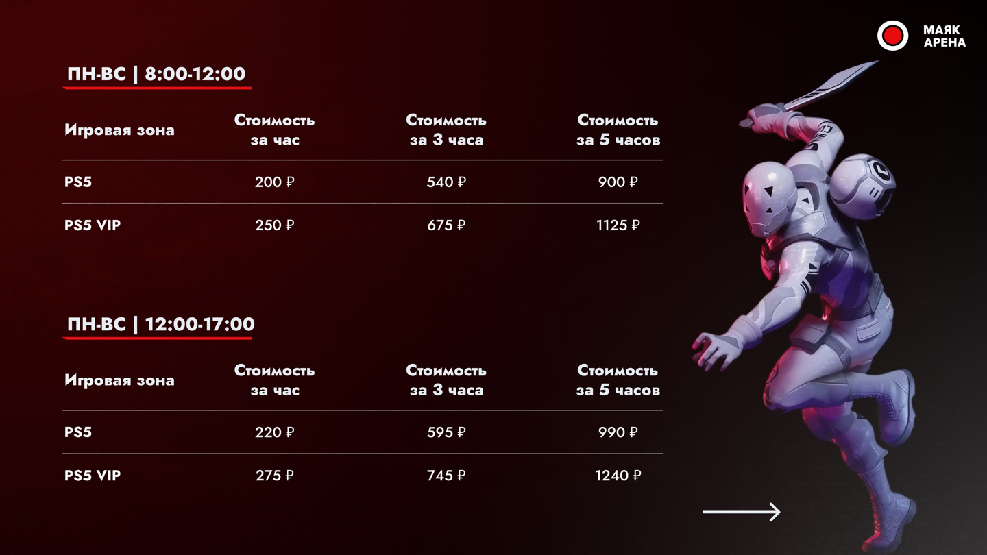 Пять премиальных PS5 на больших 4K-телевизорах с HDR и 120 FPS, включая VIP-зону с телевизором увеличенной диагонали для особого комфорта. Играйте в новейшие эксклюзивы Sony, соревнуйтесь в локальных мультиплеерах с друзьями и погрузитесь в игру с 3D-звуком и тактильными откликами DualSense.