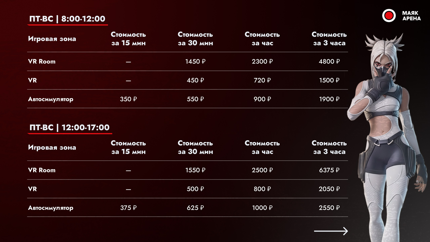Погрузитесь в захватывающие виртуальные миры, где граница между реальностью и игрой стирается! Сражайтесь вместе с друзьями в масштабных VR-баталиях на просторной 200-метровой арене. Проходите увлекательные кооперативные миссии в VR-комнатах или наслаждайтесь полным погружением в одиночных сессиях с топовыми VR-шлемами. А если вы жаждете острых ощущений, то наши VR-аттракционы способны перенести вас в мир головокружительных приключений, где каждый поворот ощущается по-настоящему!